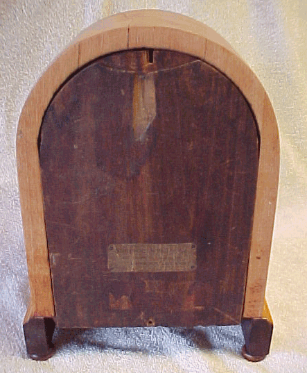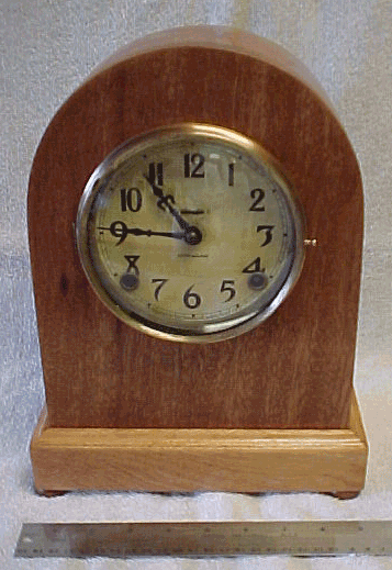 E. Ingraham Shelf or Mantle Clock Model: Unknown Year Built: Unknown Serial No. Unknown Finish: Wood is probably Cherry, with a clear Antique Oil Finish applied. Movement: E. Ingraham, Condition: Excellent. Freshly refinished. The case top has been cracked at one time, cracks show, but it is a good repair. Original Dial. Movement Condition: Excellent. Movement has just been overhauled and has a 1 year warrantee. Price: $225.00 F.O.B Grover, NC